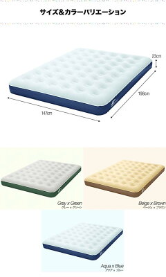 レジャーやアウトドアはもちろん、急な来客用としても大活躍なエアーベッド! FIELDOOR エアーベッド クイーンサイズ(幅147x198x23cm)【3カラー】 商品詳細(エアーベッド)ブランドフィールドア(FIELDOOR)カラー・グレー×グリーン・ベージュ×ブラウン・アクア×ブルーサイズ(約)幅147cm×奥行198cm×厚さ23cm クイーンサイズ材質PVC(ポリ塩化ビニール)※表面 : フロック仕上げ重量(約)3.2kg耐荷重(約)150kg特記事項※エアポンプは付属しておりません。